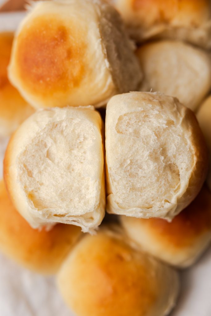 This is a great bread recipe even if you don’t need big batch dinner rolls right now because it’s pretty easy to freeze what you don’t eat. When testing this I put half of the recipe in the freezer to save the bread for the future. It was just as good when defrosted and eaten a few weeks later. If you want to freeze let the bread come to room temperature, place in a large Ziplock bag. I use the straw trick where you close the bag most of the way, put a straw in and suck air out before closing completely. It’s like using a vacuum sealer but it doesn’t crush the bread.