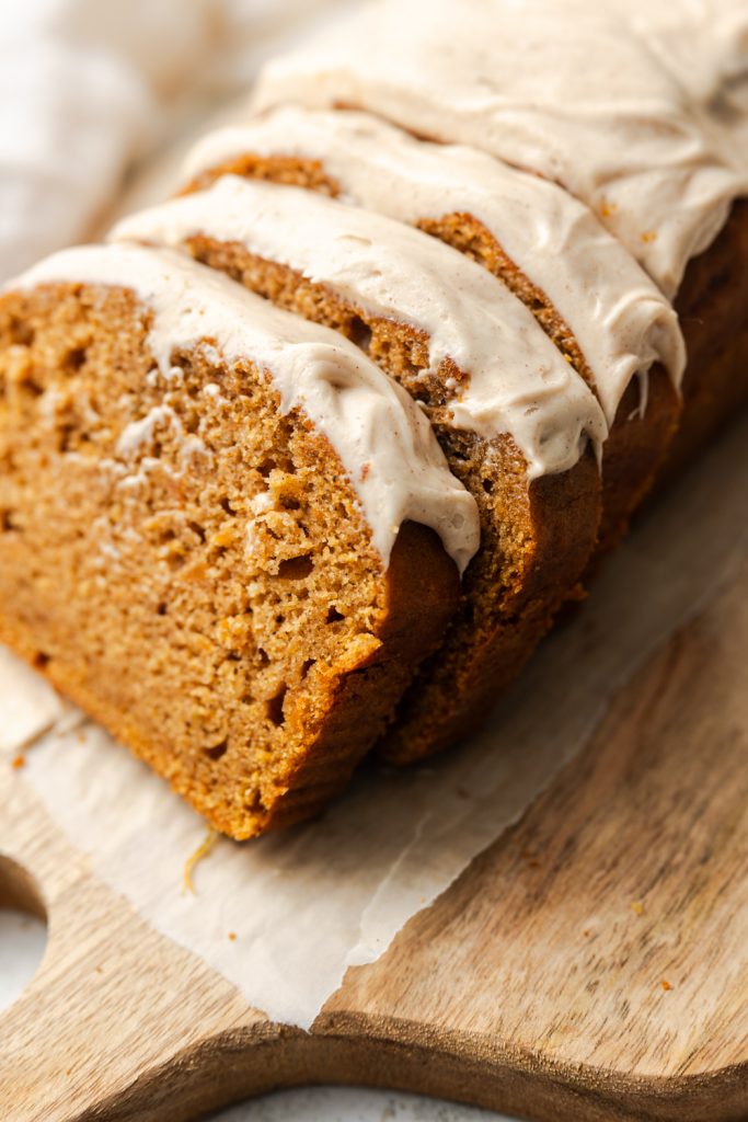 • Spread your frosting over the top of your loaf in a generous layer. Store your sweet potato loaf in an airtight container for 2-4 days. Slice and enjoy!