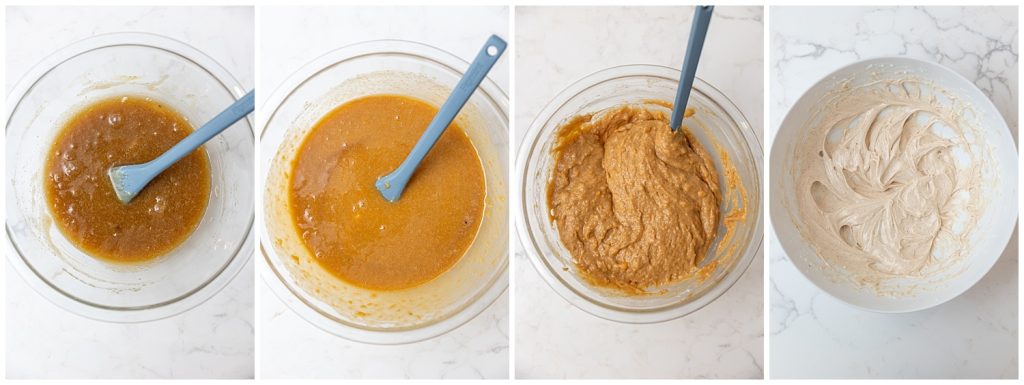 • Add your dry ingredients to the wet and mix together with a spatula just until no dry areas remain.