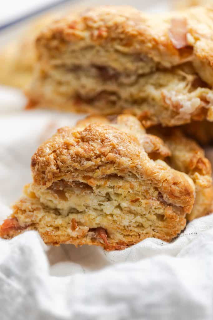 I’ve made semi-savory scones before. Goat cheese & hot honey, and apple cheddar. But these are really first (and maybe only) truly savory scone. I love scones, but I really just see them as a sweet pastry. I like to save savory flavors for biscuits. This is not a widely held belief or rule, just a personal one. Feel free to agree or disagree. But cheese knows no bounds so it must also be added to scones.