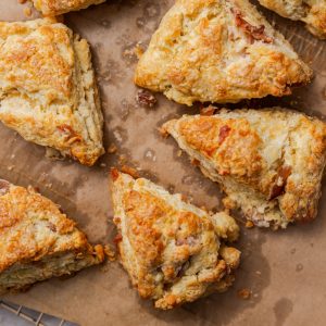 Cheesy prosciutto scones are exactly what you’re picturing. Savory scones loaded with cheese and prosciutto to create a rich, and flavorful breakfast treat.