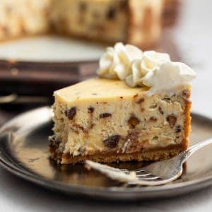Now, even with a water bath, I have baked this cheesecake and had it crack a little bit. Maybe it was a little overbaked, or maybe it was because it cooled first around a bigger chunk of chocolate, I’m not positive, but either way the cheesecake tasted delicious. You can always hide a crack with some whipped cream!