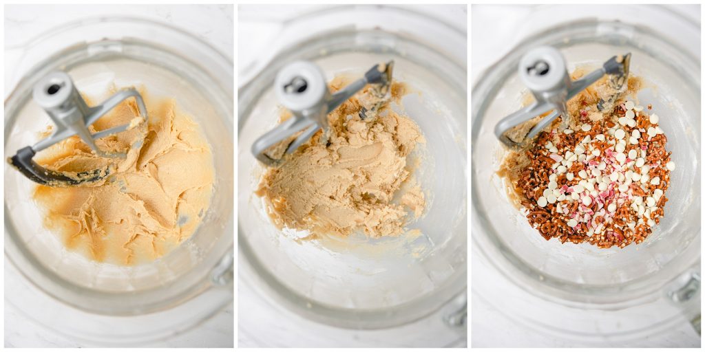 - Add in your pretzels, peppermint bits, and white chocolate and use a rubber spatula or wooden spoon to stir them into the cookie dough, making sure they are all dispersed evenly.