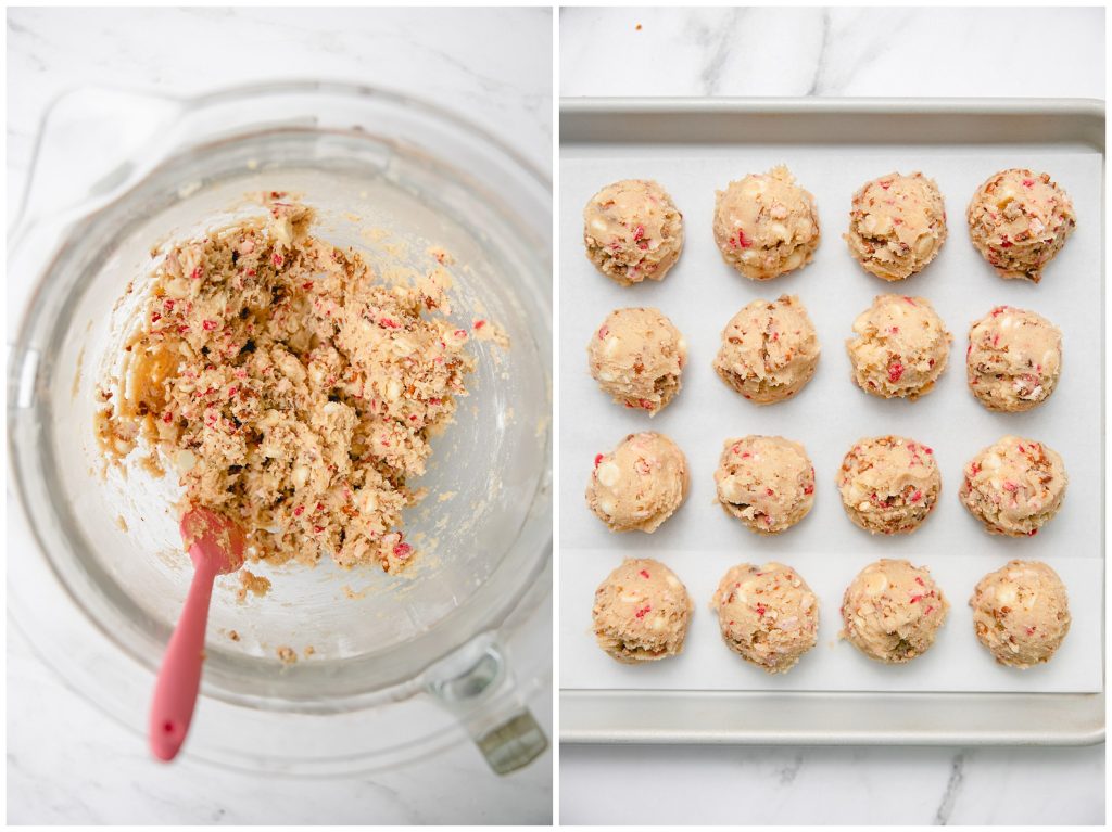 These cookies are pretty easy to make. If you have made a chocolate chip cookie, you can make these no problem. The base is a brown sugar cookie, I adapted from my brown sugar cookie recipe. I decided to use light brown sugar instead of dark because I didn’t want too strong of a caramel/molasses flavor competing with the white chocolate and peppermint. I also skipped browning the butter for the same reason.